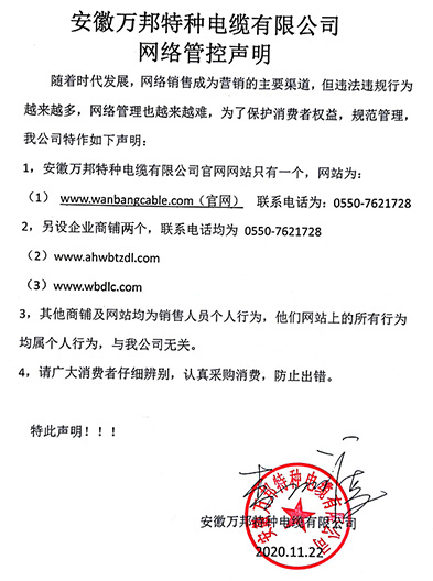 鄭重聲明:安徽萬邦特種電纜有限公司官方網站為:www_wanbangcable_com.nbbwre.cn,除此之外無任何子網站或合作網站,其余均為假冒偽劣。電話:0550-7621728 13485756353 地 址:安徽省天長市滁州高新技術產業開發區經四路29號
